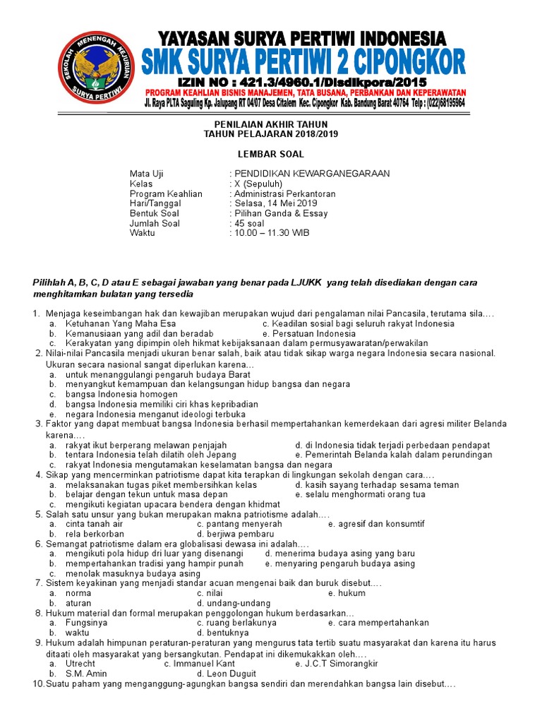 Contoh Soal PKN Kelas X Semester 2 tentang Ancaman dan Pembahasannya